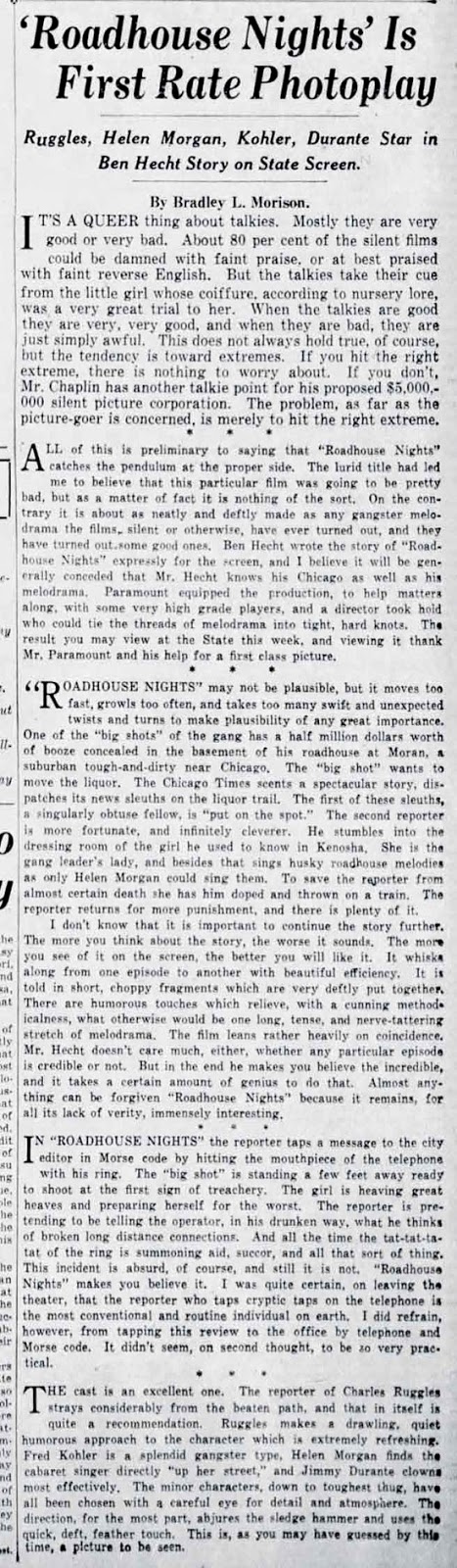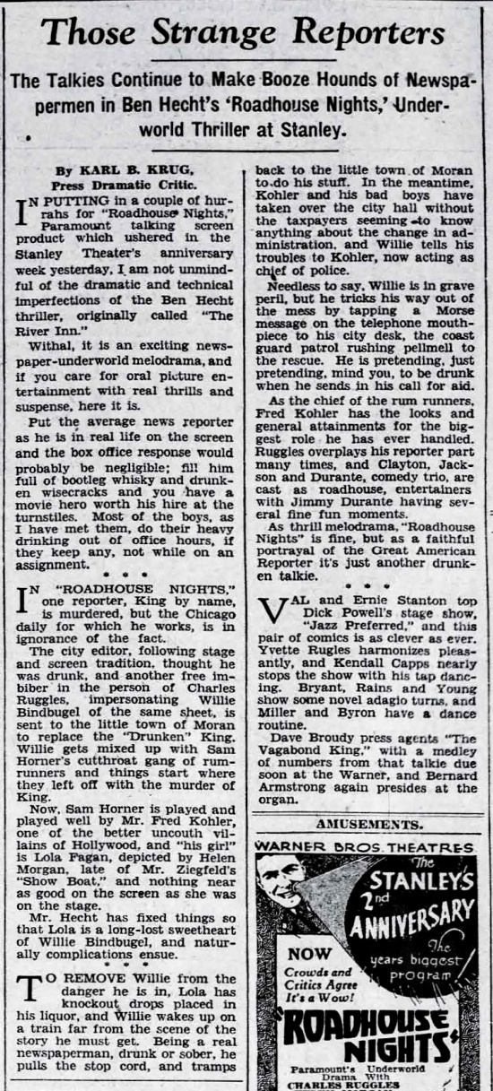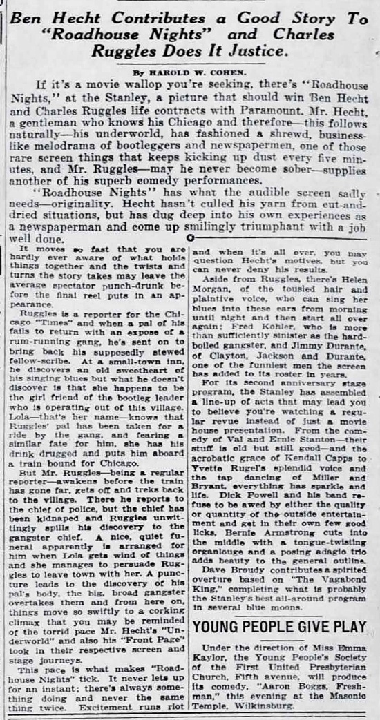 If you google "Roadhouse Nights," you'll learn that Sally Cline, in her 2014 book, Dashiell Hammett, Man of Mystery, said the film was based on Red Harvest. And you won't learn much else.